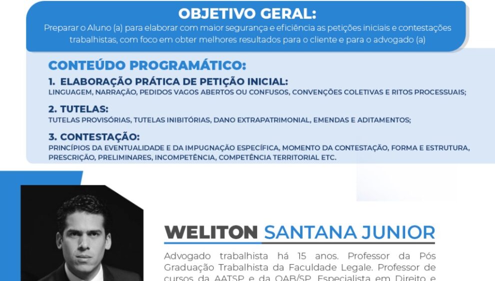Preparar o Aluno (a) para elaborar com maior segurança e eficiência as petições iniciais e contestações trabalhistas, com foco em obter melhores resultados para o cliente e para o advogado (a)